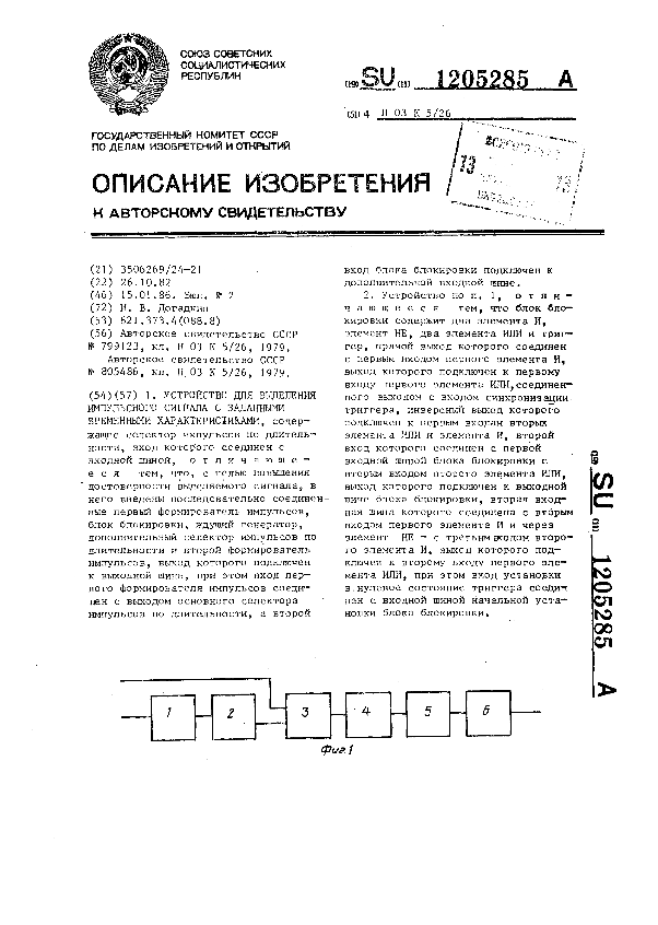 Устройство для выделения импульсного сигнала с заданными временными характеристиками / Догадкин И. В. // Описания изобретений (ретрофонд) / Комитет по патентам и товарным знакам России. – М., 2003. – 1986, № 1. — (Патенты России). — Загл. с титул. экрана. — Поисковая система: ИПС MIMOSA GTI. — Систем. требования: Acrobat Reader. — Режим доступа: ftp://smolensklib.ru/bd/patent_ru/pt1205285.pdf. — <URL:ftp://smolensklib.ru/bd/patent_ru/pt1205285.pdf>.