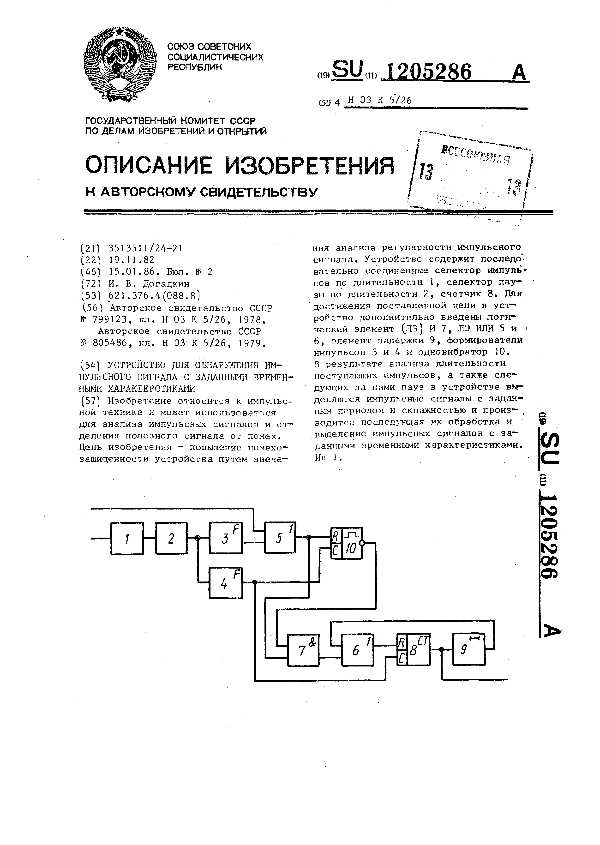 Устройство для обнаружения импульсного сигнала с заданными временными характеристиками / Догадкин И. В. // Описания изобретений (ретрофонд) / Комитет по патентам и товарным знакам России. – М., 2003. – 1986, № 1. — (Патенты России). — Загл. с титул. экрана. — Поисковая система: ИПС MIMOSA GTI. — Систем. требования: Acrobat Reader. — Режим доступа: ftp://smolensklib.ru/bd/patent_ru/pt1205286.pdf. — <URL:ftp://smolensklib.ru/bd/patent_ru/pt1205286.pdf>.
