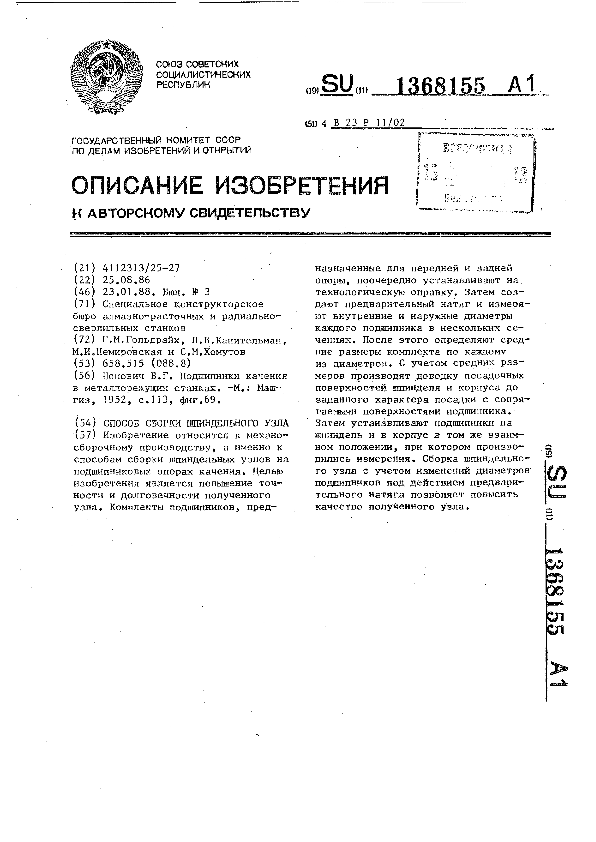 Способ сборки шпиндельного узла / Гольдрайх Г. М., Капительман Л. В., Немировская М. И., Хомутов С. М.; завитель: Специальное конструкторское бюро алмазно-расточных и радиальносверлильных станков // Описания изобретений (ретрофонд) / Комитет по патентам и товарным знакам России. — М., 1994-____. — (Патенты России). – 1988, № 1. — Загл. с титул. экрана. — Поисковая система: ИПС MIMOSA GTI. — Систем. требования: Acrobat Reader. — Режим доступа: ftp://smolensklib.ru/bd/patent_ru/pt1368155.pdf. — <URL:ftp://smolensklib.ru/bd/patent_ru/pt1368155.pdf>.