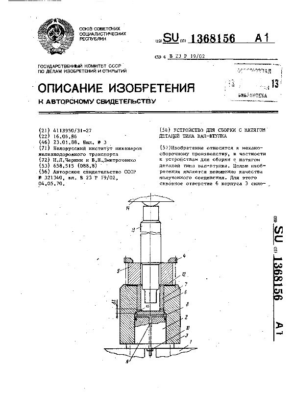 Устройство для сборки с натягом деталей типа вал-втулка / Чернин И. Л., Дмитроченко В. Н.; завитель: Белорусский институт инженеров железнодорожного транспорта // Описания изобретений (ретрофонд) / Комитет по патентам и товарным знакам России. — М., 1994-____. — (Патенты России). – 1988, № 1. — Загл. с титул. экрана. — Поисковая система: ИПС MIMOSA GTI. — Систем. требования: Acrobat Reader. — Режим доступа: ftp://smolensklib.ru/bd/patent_ru/pt1368156.pdf. — <URL:ftp://smolensklib.ru/bd/patent_ru/pt1368156.pdf>.