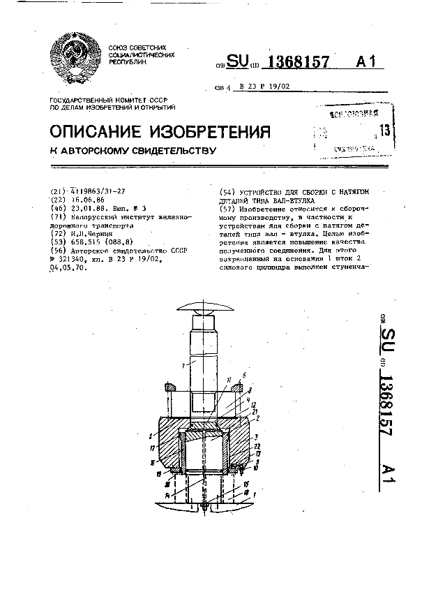 Устройство для сборки с натягом деталей типа вал-втулка / Чернин И. Л.; завитель: Белорусский институт инженеров железнодорожного транспорта // Описания изобретений (ретрофонд) / Комитет по патентам и товарным знакам России. — М., 1994-____. — (Патенты России). – 1988, № 1. — Загл. с титул. экрана. — Поисковая система: ИПС MIMOSA GTI. — Систем. требования: Acrobat Reader. — Режим доступа: ftp://smolensklib.ru/bd/patent_ru/pt1368157.pdf. — <URL:ftp://smolensklib.ru/bd/patent_ru/pt1368157.pdf>.