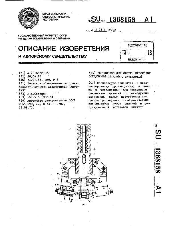 Устройство для сборки прессовых соединений деталей с зачеканкой / Соболев Л. В.; завитель: Волжское объединение по производству легковых автомобилей "АвтоВАЗ" // Описания изобретений (ретрофонд) / Комитет по патентам и товарным знакам России. — М., 1994-____. — (Патенты России). – 1988, № 1. — Загл. с титул. экрана. — Поисковая система: ИПС MIMOSA GTI. — Систем. требования: Acrobat Reader. — Режим доступа: ftp://smolensklib.ru/bd/patent_ru/pt1368158.pdf. — <URL:ftp://smolensklib.ru/bd/patent_ru/pt1368158.pdf>.