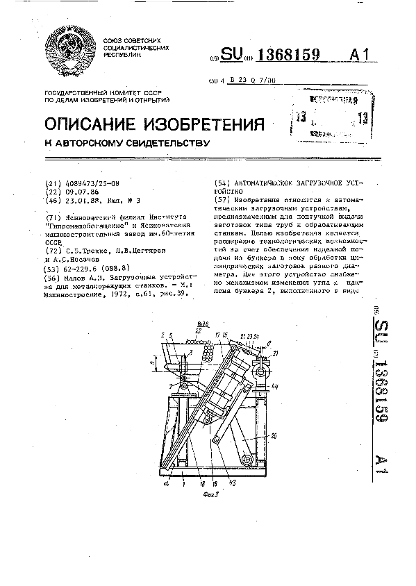 Автоматическое загрузочное устройство / Трекке С. Б., Дегтярев Л. В., Носачев А. С.; завитель: Ясиноватский филиал Института "Гипромашобогащение", Ясиноватский машиностроительный завод им.60-летия СССР // Описания изобретений (ретрофонд) / Комитет по патентам и товарным знакам России. — М., 1994-____. — (Патенты России). – 1988, № 1. — Загл. с титул. экрана. — Поисковая система: ИПС MIMOSA GTI. — Систем. требования: Acrobat Reader. — Режим доступа: ftp://smolensklib.ru/bd/patent_ru/pt1368159.pdf. — <URL:ftp://smolensklib.ru/bd/patent_ru/pt1368159.pdf>.