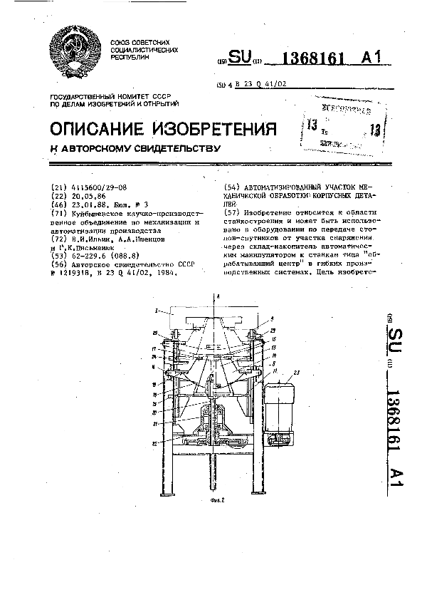 Автоматизированный участок механической обработки корпусных деталей / Ильин В. И., Пшенцов А. А., Письменюк Г. К.; заявитель: Куйбышевское научно-производственное объединение по механизации и автоматизации производства // Описания изобретений (ретрофонд) / Комитет по патентам и товарным знакам России. — М., 1994-____. — (Патенты России). – 1988, № 1. — Загл. с титул. экрана. — Поисковая система: ИПС MIMOSA GTI. — Систем. требования: Acrobat Reader. — Режим доступа: ftp://smolensklib.ru/bd/patent_ru/pt1368161.pdf. — <URL:ftp://smolensklib.ru/bd/patent_ru/pt1368161.pdf>.