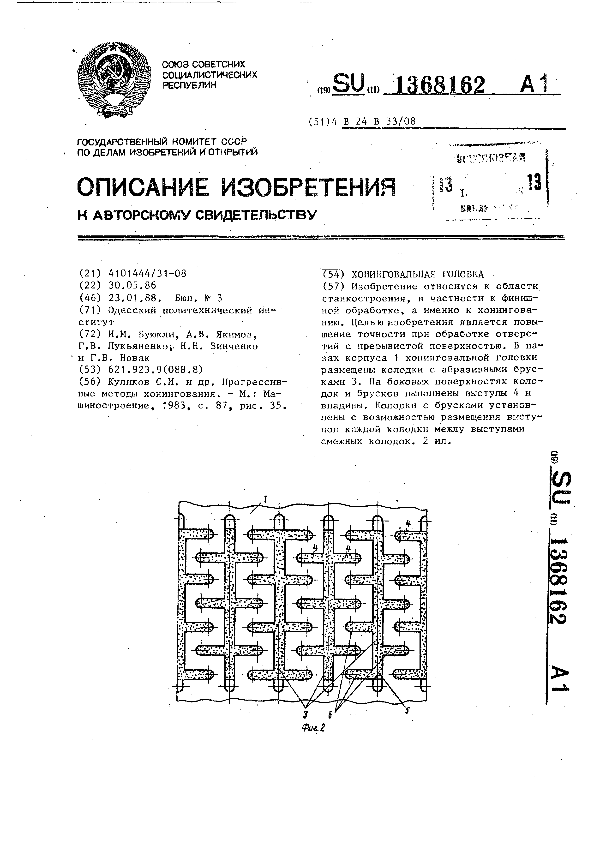 Хонинговальная головка / Буюкли И. М., Якимов А. В., Лукьяненко Г. В. [и др.]; заявитель: Одесский политехнический институт // Описания изобретений (ретрофонд) / Комитет по патентам и товарным знакам России. — М., 1994-____. — (Патенты России). – 1988, № 1. — Загл. с титул. экрана. — Поисковая система: ИПС MIMOSA GTI. — Систем. требования: Acrobat Reader. — Режим доступа: ftp://smolensklib.ru/bd/patent_ru/pt1368162.pdf. — <URL:ftp://smolensklib.ru/bd/patent_ru/pt1368162.pdf>.