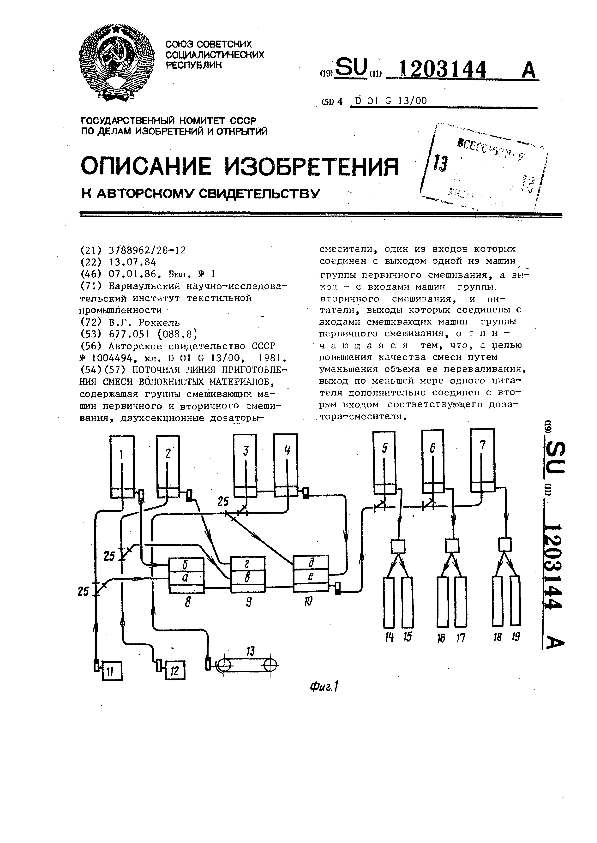 Поточная линия приготовления смеси волокнистых материалов / Роккель В. Г.; заявитель: Барнаульский научно-исследовательский институт текстильной промышленности // Описания изобретений (ретрофонд) / Комитет по патентам и товарным знакам России. – М., 2003. – 1986, № 1 — 1 файл: 191 Кб: ил. — (Патенты России). — Загл. с титул. экрана. — Поисковая система: ИПС MIMOSA GTI. — Систем. требования: Acrobat Reader. — Режим доступа: ftp://smolensklib.ru/bd/patent_ru/pt1203144.pdf. — <URL:ftp://smolensklib.ru/bd/patent_ru/pt1203144.pdf>.