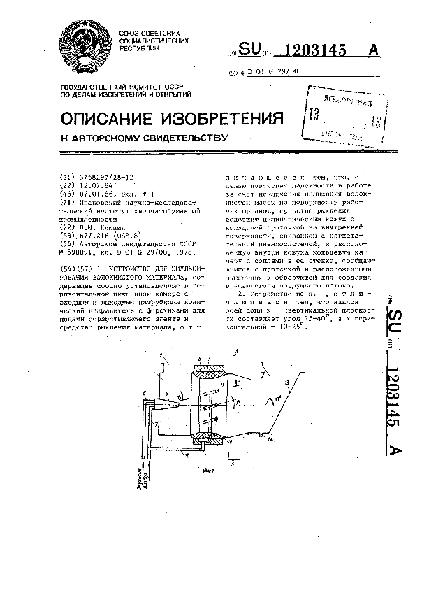 Устройство для эмульсирования волокнистого материала / Клюнин В. М.; заявитель: Ивановский научно-исследовательский институт хлопчатобумажной промышленности // Описания изобретений (ретрофонд) / Комитет по патентам и товарным знакам России. – М., 2003. – 1986, № 1 — 1 файл: 189 Кб: ил. — (Патенты России). — Загл. с титул. экрана. — Поисковая система: ИПС MIMOSA GTI. — Систем. требования: Acrobat Reader. — Режим доступа: ftp://smolensklib.ru/bd/patent_ru/pt1203145.pdf. — <URL:ftp://smolensklib.ru/bd/patent_ru/pt1203145.pdf>.