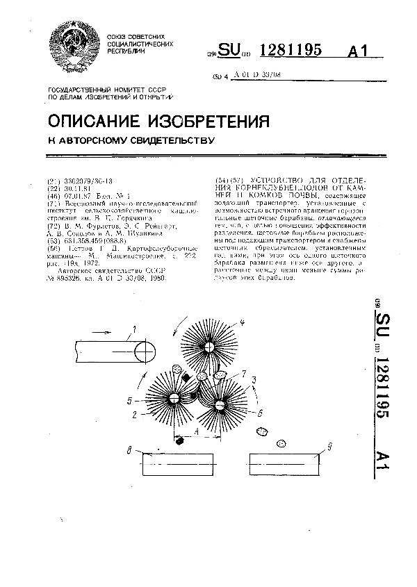 Устройство для отделения корнеклубнеплодов от камней и комков почвы / Фурлетов В. М., Рейнгарт Э. С., Соколов А. В., Шуликина А. М.; заявитель: Всесоюзный научно-исследовательский институт сельскохозяйственного машиностроения им. В. П. Горячкина // Описания изобретений (ретрофонд) / Комитет по патентам и товарным знакам России. – М., 2003. – 1987, № 1 — файл: 129 Кб: ил. — (Патенты России). — Загл. с титул. экрана. — Поисковая система: MIMOSA GTI. — Систем. требования: Acrobat Reader. — Режим доступа: ftp://smolensklib.ru/bd/patent_ru/pt1281195.pdf. — <URL:ftp://smolensklib.ru/bd/patent_ru/pt1281195.pdf>.