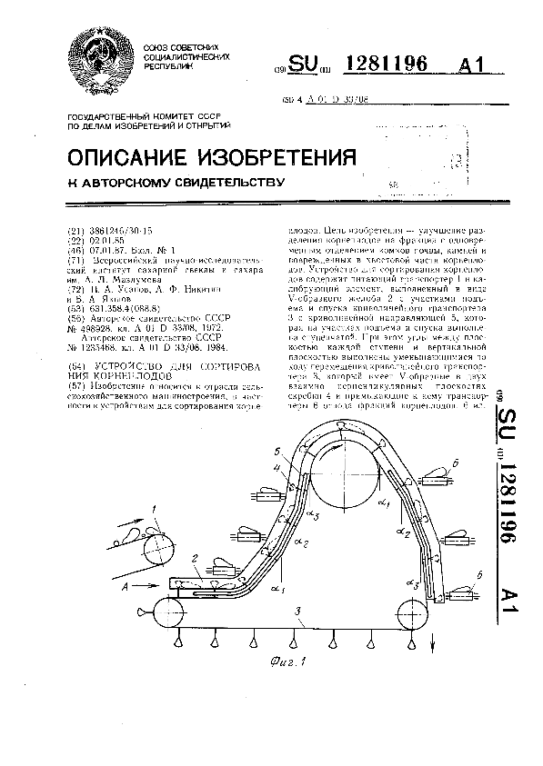 Устройство для сортирования корнеплодов / Усанов Н. А., Никитин А. Ф., Якшов Б. А.; заявитель: Всероссийский научно-исследовательский институт сахарной свеклы и сахара им. А. Л. Мазлумова // Описания изобретений (ретрофонд) / Комитет по патентам и товарным знакам России. – М., 2003. – 1987, № 1 — файл: 156 Кб: ил. — (Патенты России). — Загл. с титул. экрана. — Поисковая система: MIMOSA GTI. — Систем. требования: Acrobat Reader. — Режим доступа: ftp://smolensklib.ru/bd/patent_ru/pt1281196.pdf. — <URL:ftp://smolensklib.ru/bd/patent_ru/pt1281196.pdf>.