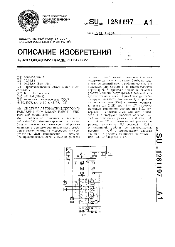 Система автоматического управления режимами работы уборочной машины / Клементьев К. В.; заявитель: Производственное объединение «Гомсельмаш» // Описания изобретений (ретрофонд) / Комитет по патентам и товарным знакам России. – М., 2003. – 1987, № 1 — файл: 884 Кб: ил. — (Патенты России). — Загл. с титул. экрана. — Поисковая система: MIMOSA GTI. — Систем. требования: Acrobat Reader. — Режим доступа: ftp://smolensklib.ru/bd/patent_ru/pt1281197.pdf. — <URL:ftp://smolensklib.ru/bd/patent_ru/pt1281197.pdf>.