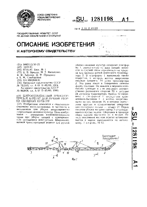 Широкозахватный транспортерный агрегат для ручной уборки овощных культур / Бридан Е. В., Василенко Н. Т., Заботин В. Ф. [и др.] // Описания изобретений (ретрофонд) / Комитет по патентам и товарным знакам России. – М., 2003. – 1987, № 1 — файл: 288 Кб: ил. — (Патенты России). — Загл. с титул. экрана. — Поисковая система: MIMOSA GTI. — Систем. требования: Acrobat Reader. — Режим доступа: ftp://smolensklib.ru/bd/patent_ru/pt1281198.pdf. — <URL:ftp://smolensklib.ru/bd/patent_ru/pt1281198.pdf>.