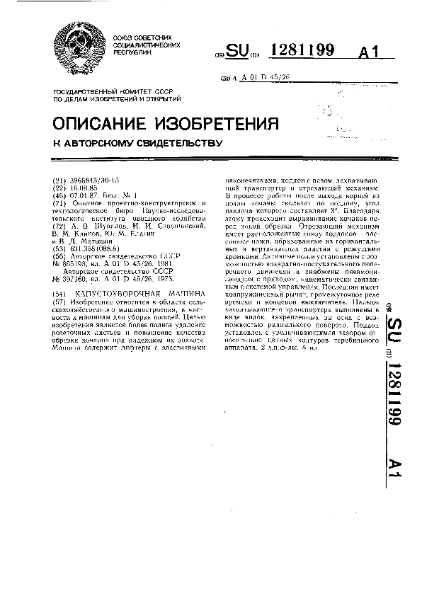 Капустоуборочная машина / Шувалов А. В., Сивашинский И. И., Клинов В. М. [и др.]; заявитель: Опытное проектно-конструкторское и технологическое бюро Научно-исследовательского института овощного хозяйства // Описания изобретений (ретрофонд) / Комитет по патентам и товарным знакам России. – М., 2003. – 1987, № 1 — файл: 330 Кб: ил. — (Патенты России). — Загл. с титул. экрана. — Поисковая система: MIMOSA GTI. — Систем. требования: Acrobat Reader. — Режим доступа: ftp://smolensklib.ru/bd/patent_ru/pt1281199.pdf. — <URL:ftp://smolensklib.ru/bd/patent_ru/pt1281199.pdf>.