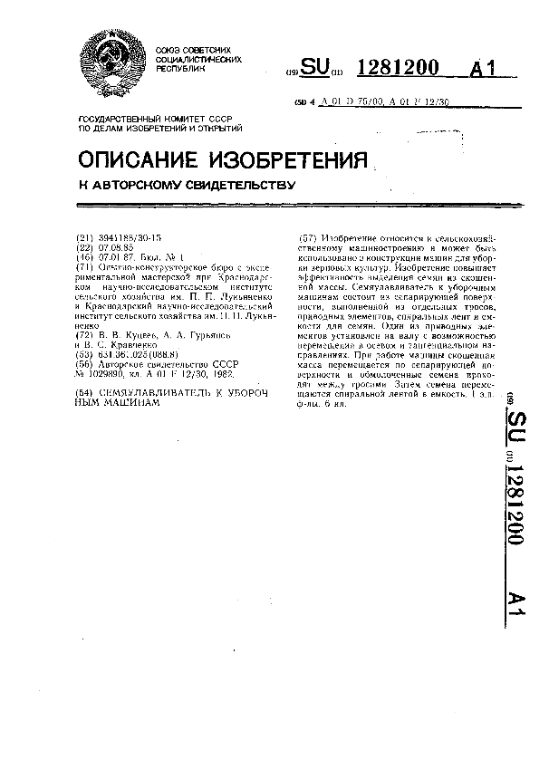 Семяулавливатель к уборочным машинам / Куцеев В. В., Гурьянов А. А., Кравченко В. С.; заявитель: Опытно-конструкторское бюро с экспериментальной мастерской при Краснодарском научно-исследовательском институте сельского хозяйства им. П. П. Лукьяненко; Краснодарский научно-исследовательский институт сельского хозяйства им. П. П. Лукьяненко // Описания изобретений (ретрофонд) / Комитет по патентам и товарным знакам России. – М., 2003. – 1987, № 1 — файл: 219 Кб: ил. — (Патенты России). — Загл. с титул. экрана. — Поисковая система: MIMOSA GTI. — Систем. требования: Acrobat Reader. — Режим доступа: ftp://smolensklib.ru/bd/patent_ru/pt1281200.pdf. — <URL:ftp://smolensklib.ru/bd/patent_ru/pt1281200.pdf>.