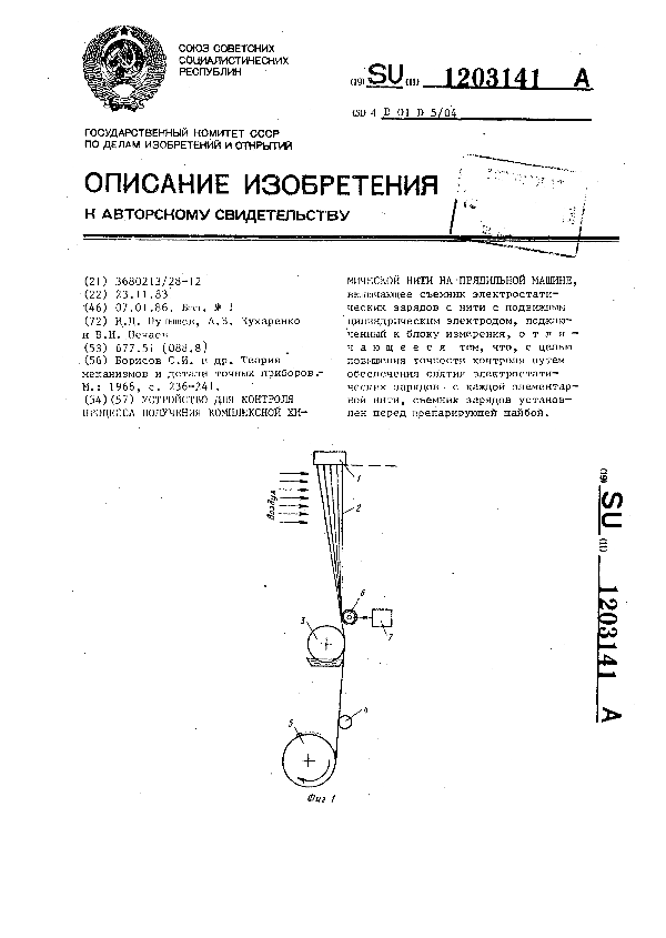 Устройство для контроля процесса получения комплексной химической нити на прядильной машине / Пупышев И. Д., Кухаренко А. В., Нечаев В. И. // Описания изобретений (ретрофонд) / Комитет по патентам и товарным знакам России. – М., 2003. – 1986, № 1 — 1 файл: 108 Кб: ил. — (Патенты России). — Загл. с титул. экрана. — Поисковая система: ИПС MIMOSA GTI. — Систем. требования: Acrobat Reader. — Режим доступа: ftp://smolensklib.ru/bd/patent_ru/pt1203141.pdf. — <URL:ftp://smolensklib.ru/bd/patent_ru/pt1203141.pdf>.