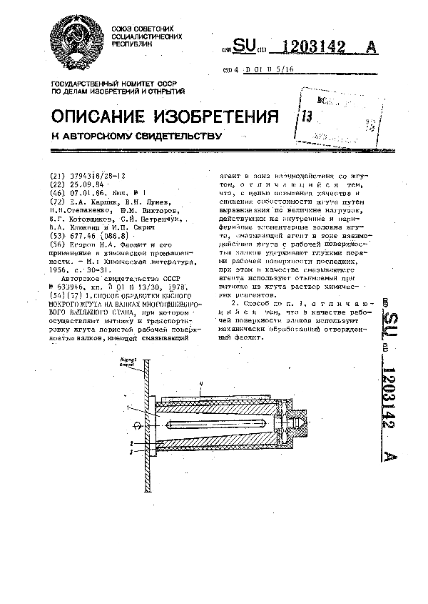 Способ обработки кислого мокрого жгута на валках многоцилиндрового вытяжного стана / Карлик Е. А., Лунев В. И., Степаненко Н. Н. [ и др.] // Описания изобретений (ретрофонд) / Комитет по патентам и товарным знакам России. – М., 2003. – 1986, № 1 — 1 файл: 154 Кб: ил. — (Патенты России). — Загл. с титул. экрана. — Поисковая система: ИПС MIMOSA GTI. — Систем. требования: Acrobat Reader. — Режим доступа: ftp://smolensklib.ru/bd/patent_ru/pt1203142.pdf. — <URL:ftp://smolensklib.ru/bd/patent_ru/pt1203142.pdf>.