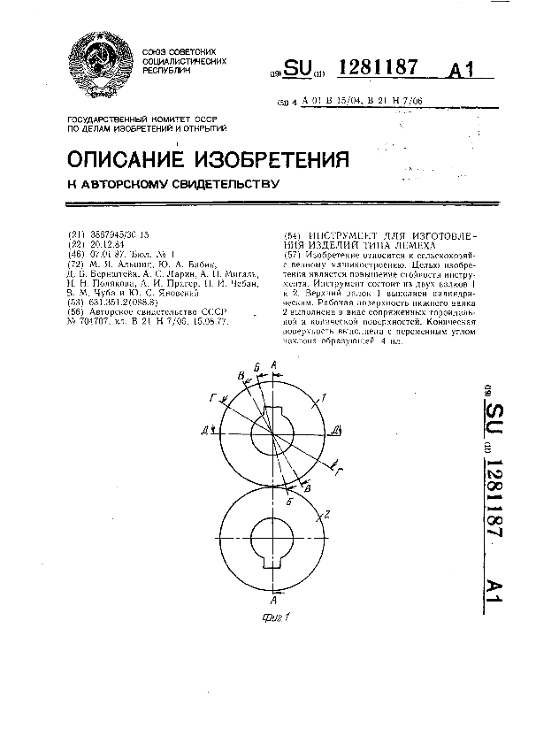 Инструмент для изготовления изделий типа лемеха / Альшиц М. Я., Бабин Ю. А., Бернштейн Д. Б. [и др.] // Описания изобретений (ретрофонд) / Комитет по патентам и товарным знакам России. – М., 2003. – 1987, № 1 — файл: 101 Кб: ил. — (Патенты России). — Загл. с титул. экрана. — Поисковая система: MIMOSA GTI. — Систем. требования: Acrobat Reader. — Режим доступа: ftp://smolensklib.ru/bd/patent_ru/pt1281187.pdf. — <URL:ftp://smolensklib.ru/bd/patent_ru/pt1281187.pdf>.