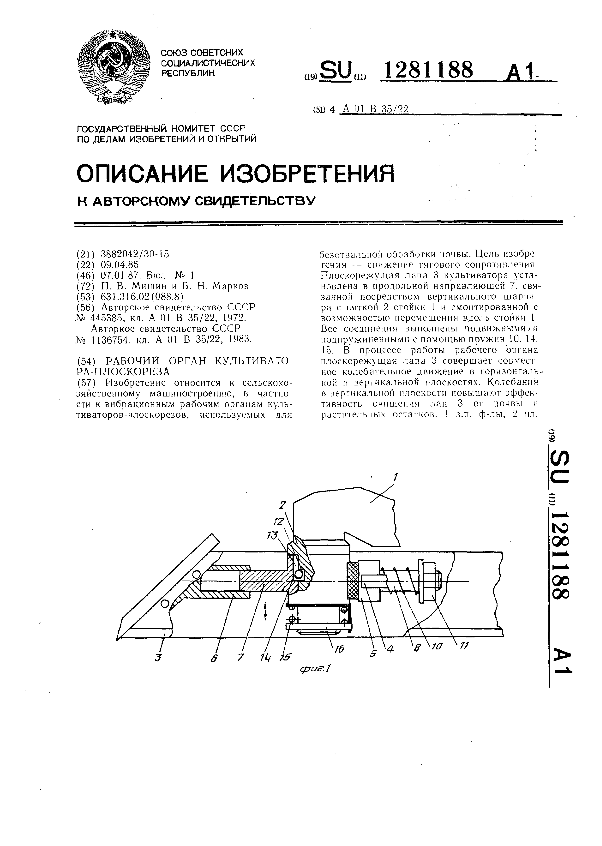 Рабочий орган культиватора-плоскореза / Мишин П. В., Марков Б. Н. // Описания изобретений (ретрофонд) / Комитет по патентам и товарным знакам России. – М., 2003. – 1987, № 1 — файл: 169 Кб: ил. — (Патенты России). — Загл. с титул. экрана. — Поисковая система: MIMOSA GTI. — Систем. требования: Acrobat Reader. — Режим доступа: ftp://smolensklib.ru/bd/patent_ru/pt1281188.pdf. — <URL:ftp://smolensklib.ru/bd/patent_ru/pt1281188.pdf>.