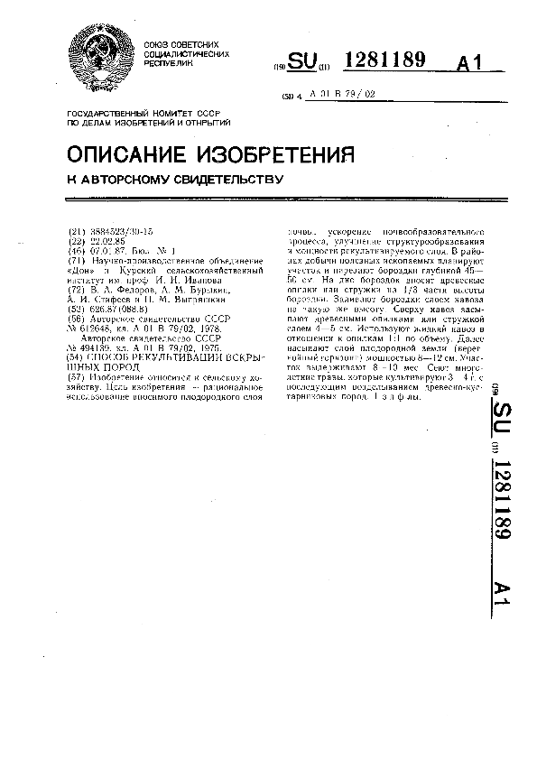 Способ рекультивации вскрышных пород / Федоров В. А., Бурыкин А. М., Стифеев А. И., Выпряшкин П. М.; заявитель: Научно-производственное объединение «Дон»; Курский сельскохозяйственный институт им. проф. И. И. Иванова // Описания изобретений (ретрофонд) / Комитет по патентам и товарным знакам России. – М., 2003. – 1987, № 1 — файл: 102 Кб: ил. — (Патенты России). — Загл. с титул. экрана. — Поисковая система: MIMOSA GTI. — Систем. требования: Acrobat Reader. — Режим доступа: ftp://smolensklib.ru/bd/patent_ru/pt1281189.pdf. — <URL:ftp://smolensklib.ru/bd/patent_ru/pt1281189.pdf>.