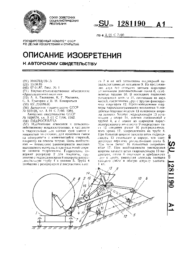 Гидросеялка / Гаспарян А. А., Меликян К. Г., Григорян С. А., Кондратьев В. И.; заявитель: Научно-производственное объединение «Армсельхозмеханизация» // Описания изобретений (ретрофонд) / Комитет по патентам и товарным знакам России. – М., 2003. – 1987, № 1 — файл: 152 Кб: ил. — (Патенты России). — Загл. с титул. экрана. — Поисковая система: MIMOSA GTI. — Систем. требования: Acrobat Reader. — Режим доступа: ftp://smolensklib.ru/bd/patent_ru/pt1281190.pdf. — <URL:ftp://smolensklib.ru/bd/patent_ru/pt1281190.pdf>.