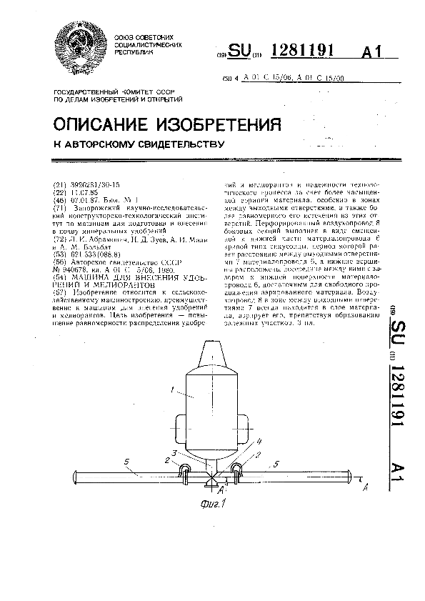 Машина для внесения удобрений и мелиорантов / Абрамович Л. И., Зуев Н. Д., Мали А. И., Больбат А. М.; заявитель: Запорожский научно-исследовательский конструкторско-технологический институт по машинам для подготовки и внесения в почву минеральных удобрений // Описания изобретений (ретрофонд) / Комитет по патентам и товарным знакам России. – М., 2003. – 1987, № 1 — файл: 122 Кб: ил. — (Патенты России). — Загл. с титул. экрана. — Поисковая система: MIMOSA GTI. — Систем. требования: Acrobat Reader. — Режим доступа: ftp://smolensklib.ru/bd/patent_ru/pt1281191.pdf. — <URL:ftp://smolensklib.ru/bd/patent_ru/pt1281191.pdf>.