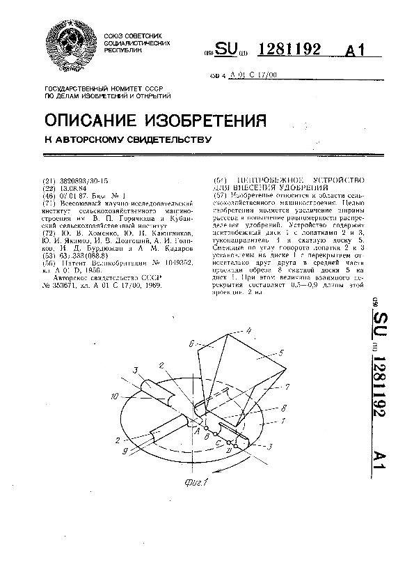 Центробежное устройство для внесения удобрений / Хоменко Ю. В., Каюшников Ю. П., Якимов Ю. И. [и др.]; заявитель: Всесоюзный научно-исследовательский институт сельскохозяйственного машиностроения им. В. П. Горячкина; Кубанский сельскохозяйственный институт // Описания изобретений (ретрофонд) / Комитет по патентам и товарным знакам России. – М., 2003. – 1987, № 1 — файл: 186 Кб: ил. — (Патенты России). — Загл. с титул. экрана. — Поисковая система: MIMOSA GTI. — Систем. требования: Acrobat Reader. — Режим доступа: ftp://smolensklib.ru/bd/patent_ru/pt1281192.pdf. — <URL:ftp://smolensklib.ru/bd/patent_ru/pt1281192.pdf>.