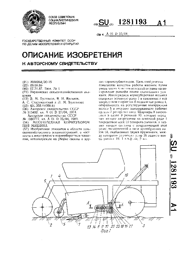 Многорядная корнеуборочная машина / Булгаков В. М., Васьков В. И., Староминский А. С., Булгакова Л. М.; заявитель: Украинская сельскохозяйственная академия // Описания изобретений (ретрофонд) / Комитет по патентам и товарным знакам России. – М., 2003. – 1987, № 1 — файл: 216 Кб: ил. — (Патенты России). — Загл. с титул. экрана. — Поисковая система: MIMOSA GTI. — Систем. требования: Acrobat Reader. — Режим доступа: ftp://smolensklib.ru/bd/patent_ru/pt1281193.pdf. — <URL:ftp://smolensklib.ru/bd/patent_ru/pt1281193.pdf>.