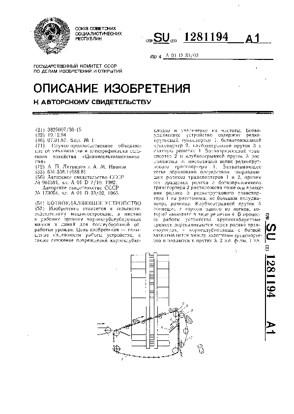 Ботвоудаляющее устройство / Литвинов А. П., Иванов А. М.; заявитель: Научно-производственное объединение по механизации и электрификации сельского хозяйства «Целинсельхозмеханизация» // Описания изобретений (ретрофонд) / Комитет по патентам и товарным знакам России. – М., 2003. – 1987, № 1 — файл: 111 Кб: ил. — (Патенты России). — Загл. с титул. экрана. — Поисковая система: MIMOSA GTI. — Систем. требования: Acrobat Reader. — Режим доступа: ftp://smolensklib.ru/bd/patent_ru/pt1281194.pdf. — <URL:ftp://smolensklib.ru/bd/patent_ru/pt1281194.pdf>.
