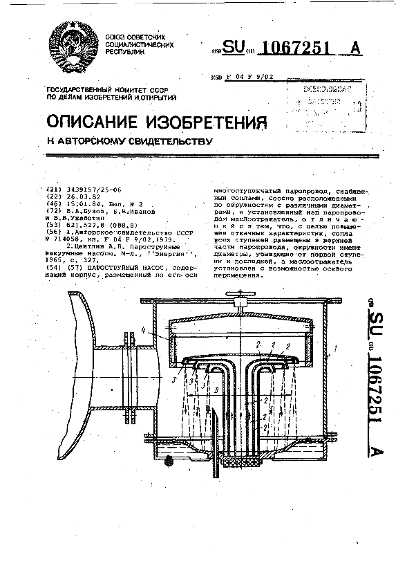 Пароструйный насос / Бузов В. А., Иванов Б. В., Ухаботин В. В. // Описания изобретений (ретрофонд) / Комитет по патентам и товарным знакам России. – М., 2003. – 1984, № 1 — 1 файл: 93 Кб: ил. — (Патенты России). — Загл. с титул. экрана. — Поисковая система: ИПС MIMOSA GTI. — Систем. требования: Acrobat Reader. — Режим доступа: ftp://smolensklib.ru/bd/patent_ru/1067251.pdf. — <URL:ftp://smolensklib.ru/bd/patent_ru/pt1067251.pdf>.