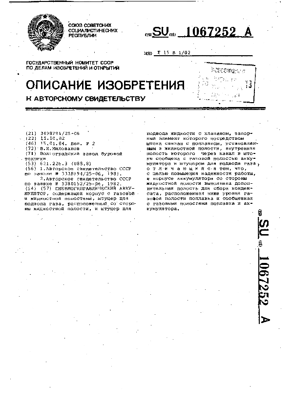 Пневмогидравлический аккумулятор / Милованов В. И.; заявитель: Волгоградский завод буровой техники // Описания изобретений (ретрофонд) / Комитет по патентам и товарным знакам России. – М., 2003. – 1984, № 1 — 1 файл: 138 Кб: ил. — (Патенты России). — Загл. с титул. экрана. — Поисковая система: ИПС MIMOSA GTI. — Систем. требования: Acrobat Reader. — Режим доступа: ftp://smolensklib.ru/bd/patent_ru/1067252.pdf. — <URL:ftp://smolensklib.ru/bd/patent_ru/pt1067252.pdf>.