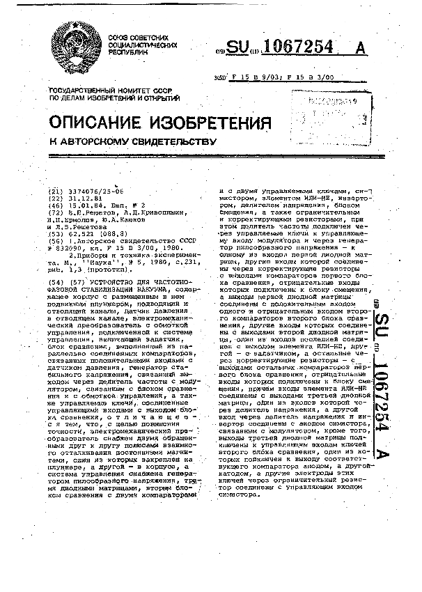 Устройство для частотно-фазовой стабилизации вакуума / Решетов В. П., Кривопишин А. Д., Ермолов Н. Н. [и др.] // Описания изобретений (ретрофонд) / Комитет по патентам и товарным знакам России. – М., 2003. – 1984, № 1 — 1 файл: 354 Кб: ил. — (Патенты России). — Загл. с титул. экрана. — Поисковая система: ИПС MIMOSA GTI. — Систем. требования: Acrobat Reader. — Режим доступа: ftp://smolensklib.ru/bd/patent_ru/1067254.pdf. — <URL:ftp://smolensklib.ru/bd/patent_ru/pt1067254.pdf>.