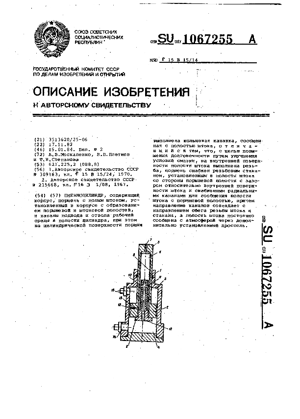 Пневмоцилиндр / Москаленко А. В., Плетнев В. П., Степанова Т. Н. // Описания изобретений (ретрофонд) / Комитет по патентам и товарным знакам России. – М., 2003. – 1984, № 1 — 1 файл: 101 Кб: ил. — (Патенты России). — Загл. с титул. экрана. — Поисковая система: ИПС MIMOSA GTI. — Систем. требования: Acrobat Reader. — Режим доступа: ftp://smolensklib.ru/bd/patent_ru/1067255.pdf. — <URL:ftp://smolensklib.ru/bd/patent_ru/pt1067255.pdf>.
