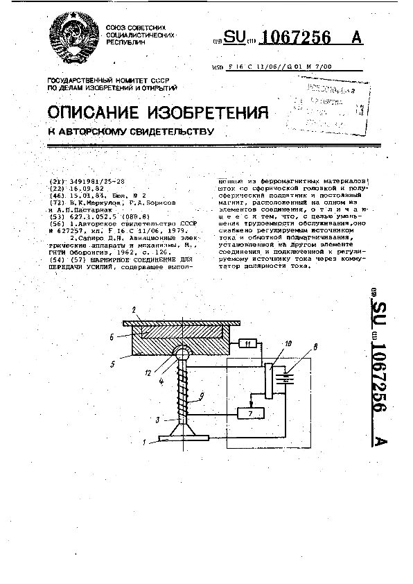 Шарнирное соединение для передачи усилий / Меркулов В. К., Борисов Г. А., Пастарнак А. П. // Описания изобретений (ретрофонд) / Комитет по патентам и товарным знакам России. – М., 2003. – 1984, № 1 — 1 файл: 111 Кб: ил. — (Патенты России). — Загл. с титул. экрана. — Поисковая система: ИПС MIMOSA GTI. — Систем. требования: Acrobat Reader. — Режим доступа: ftp://smolensklib.ru/bd/patent_ru/1067256.pdf. — <URL:ftp://smolensklib.ru/bd/patent_ru/pt1067256.pdf>.