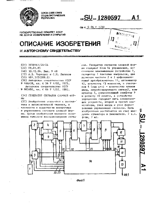 Генератор сигналов сложной формы / Чернориз А. В., Лигинов С. М. // Описания изобретений (ретрофонд) / Комитет по патентам и товарным знакам России. – М., 2003. – 1987, № 1 — файл: 418 Кб: ил. — (Патенты России). — Загл. с титул. экрана. — Поисковая система: MIMOSA GTI. — Систем. требования: Acrobat Reader. — Режим доступа: ftp://smolensklib.ru/bd/patent_ru/pt1280597.pdf. — <URL:ftp://smolensklib.ru/bd/patent_ru/pt1280597.pdf>.