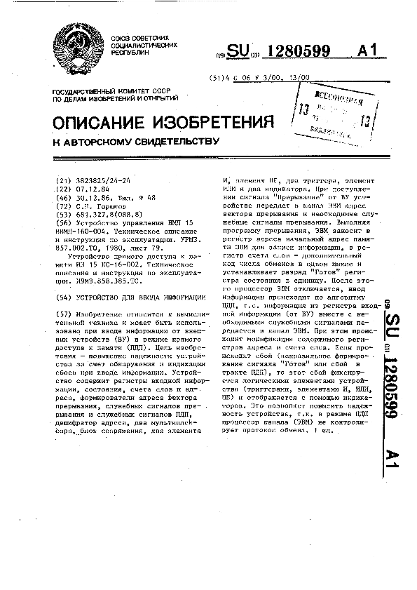 Устройство для ввода информации / Горшков С. Н. // Описания изобретений (ретрофонд) / Комитет по патентам и товарным знакам России. – М., 2003. – 1987, № 1 — файл: 152 Кб: ил. — (Патенты России). — Загл. с титул. экрана. — Поисковая система: MIMOSA GTI. — Систем. требования: Acrobat Reader. — Режим доступа: ftp://smolensklib.ru/bd/patent_ru/pt1280599.pdf. — <URL:ftp://smolensklib.ru/bd/patent_ru/pt1280599.pdf>.