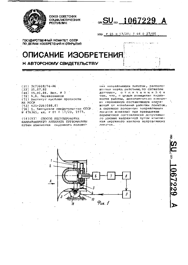 Способ регулирования направляющего аппарата турбомашины / Перевозников А. В.; заявитель: Институт проблем прочности АН УССР // Описания изобретений (ретрофонд) / Комитет по патентам и товарным знакам России. – М., 2003. – 1984, № 1 — 1 файл: 150 Кб: ил. — (Патенты России). — Загл. с титул. экрана. — Поисковая система: ИПС MIMOSA GTI. — Систем. требования: Acrobat Reader. — Режим доступа: ftp://smolensklib.ru/bd/patent_ru/pt1067229.pdf. — <URL:ftp://smolensklib.ru/bd/patent_ru/pt1067229.pdf>.