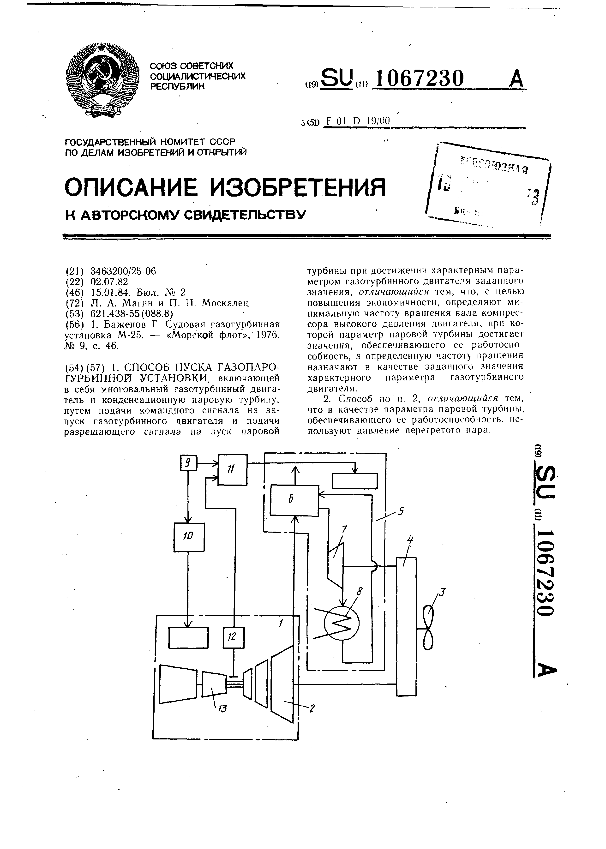 Способ пуска газопаротурбинной установки / Магин Л. А., Москалец П. П. // Описания изобретений (ретрофонд) / Комитет по патентам и товарным знакам России. – М., 2003. – 1984, № 1 — 1 файл: 136 Кб: ил. — (Патенты России). — Загл. с титул. экрана. — Поисковая система: ИПС MIMOSA GTI. — Систем. требования: Acrobat Reader. — Режим доступа: ftp://smolensklib.ru/bd/patent_ru/pt1067230.pdf. — <URL:ftp://smolensklib.ru/bd/patent_ru/pt1067230.pdf>.