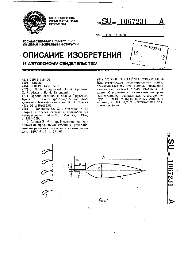 Опора статора турбомашины / Богорадовский Г. И., Кравцов Ю. А., Маев С. В., Титенский В. И.; заявитель: Ордена Ленина и ордена Трудового Красного Знамени производственное объединение «Невский завод» им. В. И. Ленина // Описания изобретений (ретрофонд) / Комитет по патентам и товарным знакам России. – М., 2003. – 1984, № 1 — 1 файл: 137 Кб: ил. — (Патенты России). — Загл. с титул. экрана. — Поисковая система: ИПС MIMOSA GTI. — Систем. требования: Acrobat Reader. — Режим доступа: ftp://smolensklib.ru/bd/patent_ru/pt1067231.pdf. — <URL:ftp://smolensklib.ru/bd/patent_ru/pt1067231.pdf>.