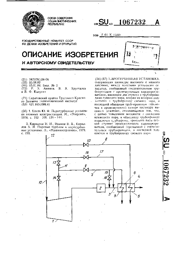 Паротурбинная установка / Аминов Р. З., Хрусталев В. А., Калугин Б. Ф.; заявитель: Саратовский ордена Трудового Красного Знамени политехнический институт // Описания изобретений (ретрофонд) / Комитет по патентам и товарным знакам России. – М., 2003. – 1984, № 1 — 1 файл: 153 Кб: ил. — (Патенты России). — Загл. с титул. экрана. — Поисковая система: ИПС MIMOSA GTI. — Систем. требования: Acrobat Reader. — Режим доступа: ftp://smolensklib.ru/bd/patent_ru/pt1067232.pdf. — <URL:ftp://smolensklib.ru/bd/patent_ru/pt1067232.pdf>.
