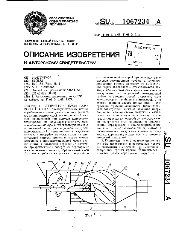 Глушитель шума газового потока / Мажоров А. С.; заявитель: Омский авторемонтный завод № 1 // Описания изобретений (ретрофонд) / Комитет по патентам и товарным знакам России. – М., 2003. – 1984, № 1 — 1 файл: 194 Кб: ил. — (Патенты России). — Загл. с титул. экрана. — Поисковая система: ИПС MIMOSA GTI. — Систем. требования: Acrobat Reader. — Режим доступа: ftp://smolensklib.ru/bd/patent_ru/pt1067234.pdf. — <URL:ftp://smolensklib.ru/bd/patent_ru/pt1067234.pdf>.