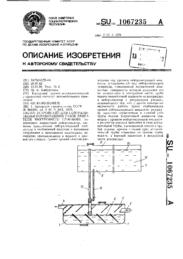 Устройство для нейтрализации отработавших газов двигателя внутреннего сгорания / Ембергенов Ш. Е.; заявитель: Казахский научно-исследовательский и проектный институт автомобильного транспорта // Описания изобретений (ретрофонд) / Комитет по патентам и товарным знакам России. – М., 2003. – 1984, № 1 — 1 файл: 134 Кб: ил. — (Патенты России). — Загл. с титул. экрана. — Поисковая система: ИПС MIMOSA GTI. — Систем. требования: Acrobat Reader. — Режим доступа: ftp://smolensklib.ru/bd/patent_ru/pt1067235.pdf. — <URL:ftp://smolensklib.ru/bd/patent_ru/pt1067235.pdf>.