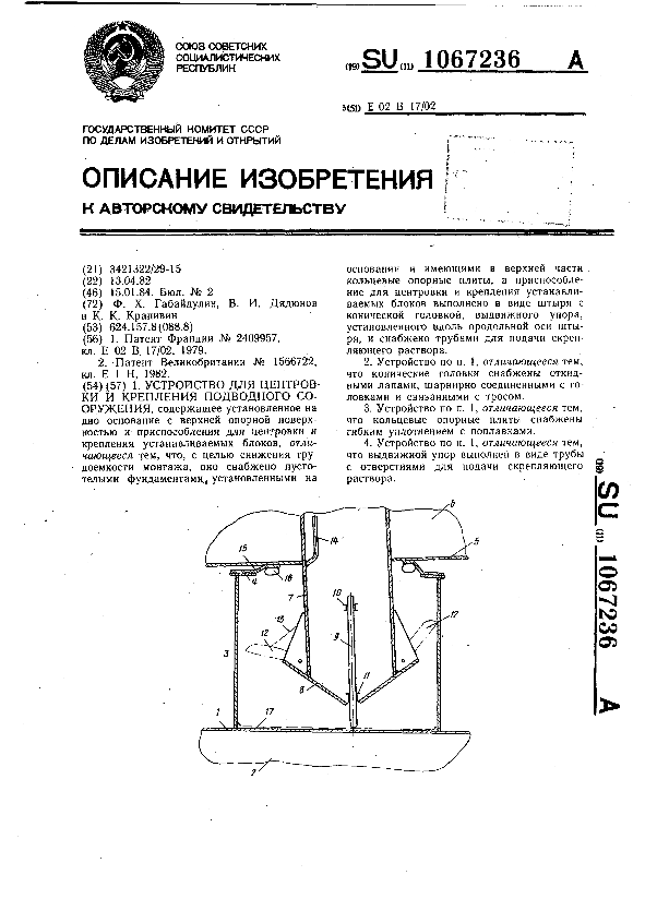 Устройство для центровки и крепления подводного сооружения / Габайдулин Ф. Х., Дядюнов В. И., Крапивин К. К. // Описания изобретений (ретрофонд) / Комитет по патентам и товарным знакам России. – М., 2003. – 1984, № 1 — 1 файл: 166 Кб: ил. — (Патенты России). — Загл. с титул. экрана. — Поисковая система: ИПС MIMOSA GTI. — Систем. требования: Acrobat Reader. — Режим доступа: ftp://smolensklib.ru/bd/patent_ru/pt1067236.pdf. — <URL:ftp://smolensklib.ru/bd/patent_ru/pt1067236.pdf>.