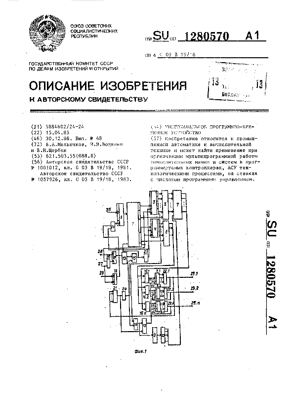 Устройство для программного управления / Кошкин В. Л., Горбенко Э. Т. // Описания изобретений (ретрофонд) / Комитет по патентам и товарным знакам России. – М., 2003. – 1987, № 1 — файл: 624 Кб: ил. — (Патенты России). — Загл. с титул. экрана. — Поисковая система: MIMOSA GTI. — Систем. требования: Acrobat Reader. — Режим доступа: ftp://smolensklib.ru/bd/patent_ru/pt1280571.pdf. — <URL:ftp://smolensklib.ru/bd/patent_ru/pt1280571.pdf>.