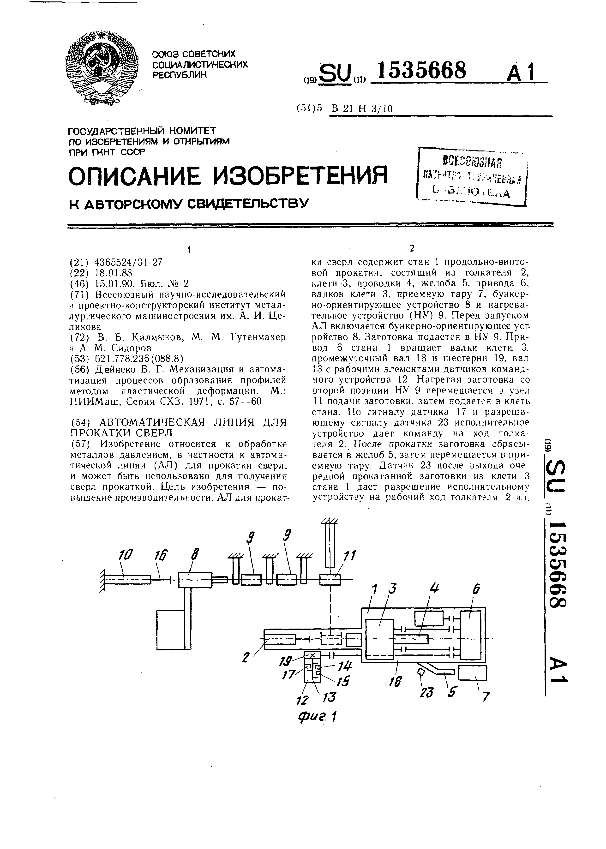 Автоматическая линия для прокатки сверл / Калмыков В. Б., Гутенмахер М. М., Сидоров А. М.; заявитель: Всесоюзный научно-исследовательский и проектно-конструкторский институт металлургического машиностроения им. А. И. Целикова // Описания изобретений (ретрофонд) / Комитет по патентам и товарным знакам России. – М., 2003. – 1990, № 1. — (Патенты России). — Загл. с титул. экрана. — Поисковая система: MIMOSA GTI. — Систем. требования: Acrobat Reader. — Режим доступа: ftp://smolensklib.ru/bd/patent_ru/pt1535668.pdf. — <URL:ftp://smolensklib.ru/bd/patent_ru/pt1535668.pdf>.