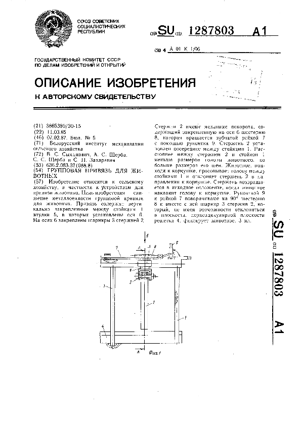 Групповая привязь для животных / Сыманович В. С., Щерба А. С., Щерба С. С., Захаревич С. П.; заявитель: Белорусский институт механизации сельского хозяйства // Описания изобретений (ретрофонд) / Комитет по патентам и товарным знакам России. – М., 2003. – 1987, № 1. — (Патенты России). — Загл. с титул. экрана. — Поисковая система: MIMOSA GTI. — Систем. требования: Acrobat Reader. — Режим доступа: ftp://smolensklib.ru/bd/patent_ru/pt1287803.pdf. — <URL:ftp://smolensklib.ru/bd/patent_ru/pt1287803.pdf>.