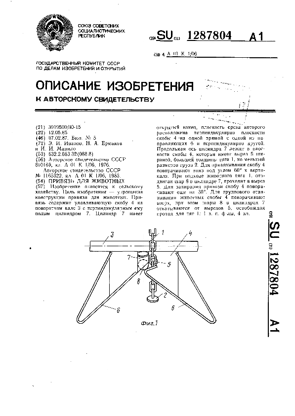 Привязь для животных / Иванов Э. И., Ермаков Н. А., Манило И. И. // Описания изобретений (ретрофонд) / Комитет по патентам и товарным знакам России. – М., 2003. – 1987, № 1. — (Патенты России). — Загл. с титул. экрана. — Поисковая система: MIMOSA GTI. — Систем. требования: Acrobat Reader. — Режим доступа: ftp://smolensklib.ru/bd/patent_ru/pt1287804.pdf. — <URL:ftp://smolensklib.ru/bd/patent_ru/pt1287804.pdf>.
