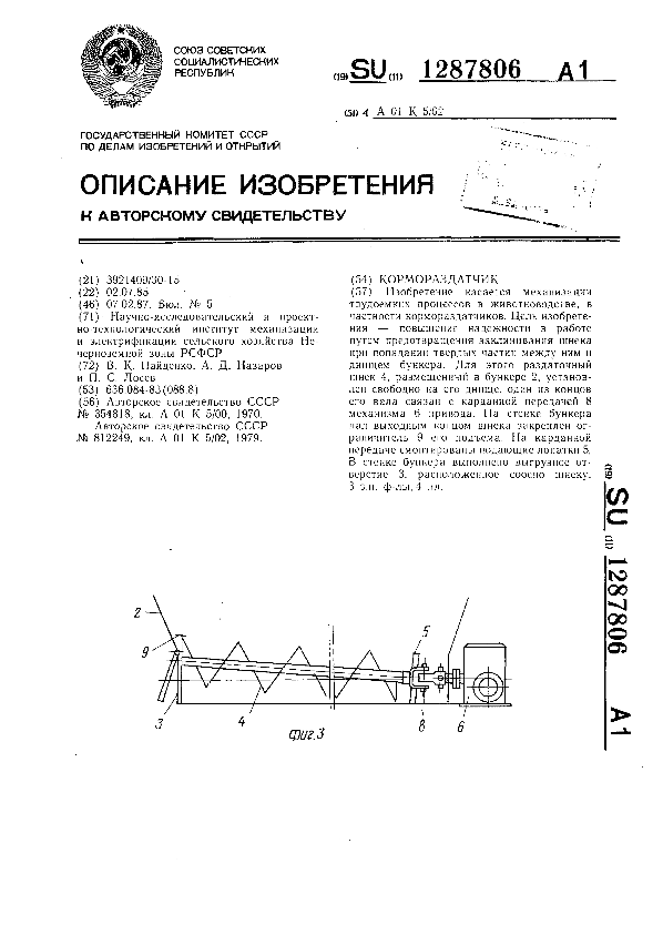 Кормораздатчик / Найденко В. К., Назаров А. Д., Лосев П. С.; заявитель: Научно-исследовательский и проектно-технологический институт механизации и электрификации сельского хозяйства Нечерноземной зоны РСФСР // Описания изобретений (ретрофонд) / Комитет по патентам и товарным знакам России. – М., 2003. – 1987, № 1. — (Патенты России). — Загл. с титул. экрана. — Поисковая система: MIMOSA GTI. — Систем. требования: Acrobat Reader. — Режим доступа: ftp://smolensklib.ru/bd/patent_ru/pt1287806.pdf. — <URL:ftp://smolensklib.ru/bd/patent_ru/pt1287806.pdf>.