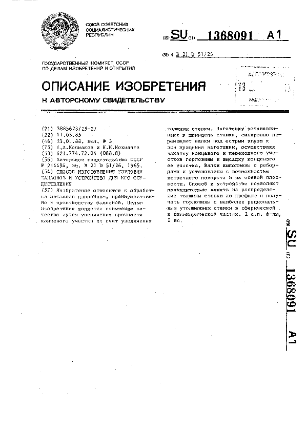 Способ изготовления горловин баллонов и устройство для его осуществления / Колмаков Е. А., Мохначев Н. И. // Описания изобретений (ретрофонд) / Комитет по патентам и товарным знакам России. — М., 1994-____. — (Патенты России). – 1988, № 1. — Загл. с титул. экрана. — Поисковая система: ИПС MIMOSA GTI. — Систем. требования: Acrobat Reader. — Режим доступа: ftp://smolensklib.ru/bd/patent_ru/pt1368091.pdf. — <URL:ftp://smolensklib.ru/bd/patent_ru/pt1368091.pdf>.
