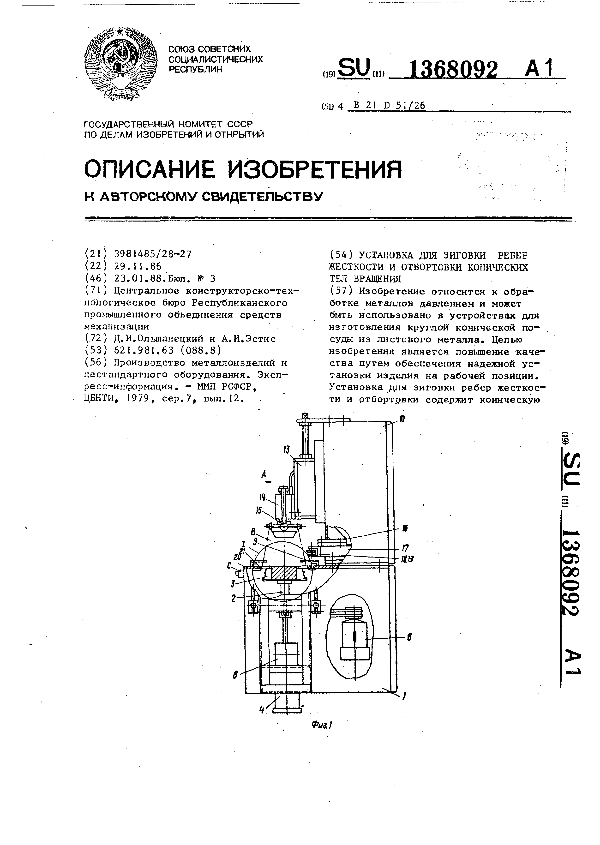 Установка для зиговки ребер жесткости и отбортовки конических тел вращения / Ольшанецкий Д. И., Эстис А. И.; заявитель: Центральное конструкторско-технологическое бюро Республиканского промышленного объединения средств механизации // Описания изобретений (ретрофонд) / Комитет по патентам и товарным знакам России. — М., 1994-____. — (Патенты России). – 1988, № 1. — Загл. с титул. экрана. — Поисковая система: ИПС MIMOSA GTI. — Систем. требования: Acrobat Reader. — Режим доступа: ftp://smolensklib.ru/bd/patent_ru/pt1368092.pdf. — <URL:ftp://smolensklib.ru/bd/patent_ru/pt1368092.pdf>.