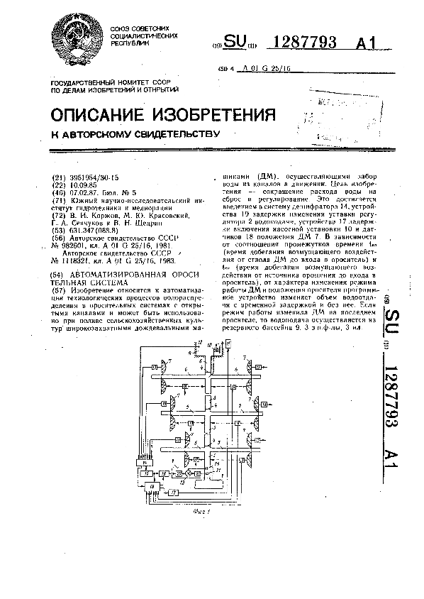Автоматизированная оросительная система / Коржов В. И., Красовский М. Ю., Сенчуков Г. А., Щедрин В. Н.; заявитель: Южный научно-исследовательский институт гидротехники и мелиорации // Описания изобретений (ретрофонд) / Комитет по патентам и товарным знакам России. – М., 2003. – 1987, № 1. — (Патенты России). — Загл. с титул. экрана. — Поисковая система: MIMOSA GTI. — Систем. требования: Acrobat Reader. — Режим доступа: ftp://smolensklib.ru/bd/patent_ru/pt1287793.pdf. — <URL:ftp://smolensklib.ru/bd/patent_ru/pt1287793.pdf>.