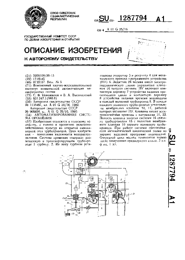 Автоматизированная система орошения / Новожилов С. В., Высочанский В. А.; заявитель: Всесоюзный научно-исследовательский институт комплексной автоматизации мелиоративных систем // Описания изобретений (ретрофонд) / Комитет по патентам и товарным знакам России. – М., 2003. – 1987, № 1. — (Патенты России). — Загл. с титул. экрана. — Поисковая система: MIMOSA GTI. — Систем. требования: Acrobat Reader. — Режим доступа: ftp://smolensklib.ru/bd/patent_ru/pt1287794.pdf. — <URL:ftp://smolensklib.ru/bd/patent_ru/pt1287794.pdf>.